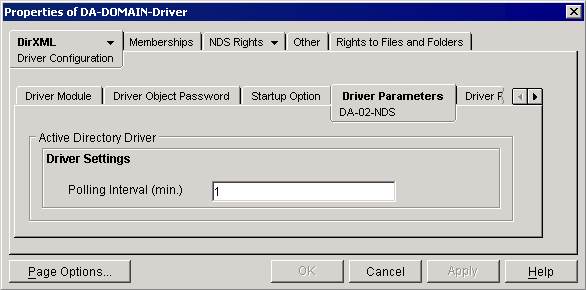 In the Properties of DA-Domain-Driver window, activate the DirXML-Driver Configuration page and the Driver Parameters-DA-02-NDS sub-page > set the Polling Interval field to 1 > click OK.