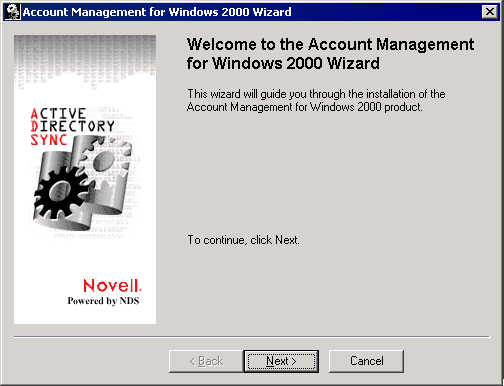 In the Account Management for Windows 2000 Product Installation Welcome window, click Next.