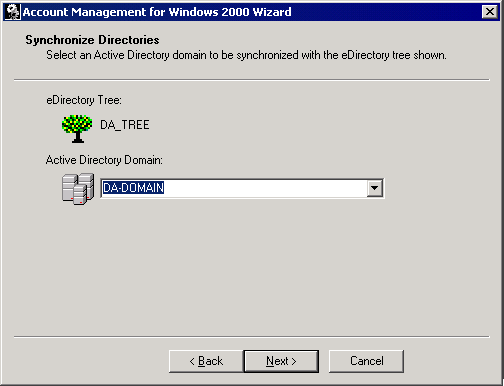On the Synchronize Directories page, ensure that the Active Directory Domain field specifies DA-Domain > click Next.