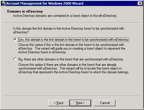 In the Domains in eDirectory window, select Yes, This Domain Is the First Domain in the Forest To Be Synchronized with eDirectory > click Next.