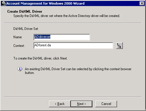 In the Create DirXML Driver page's Name field, type Addriverset > for the Context, type Adforest.DA > click Next.