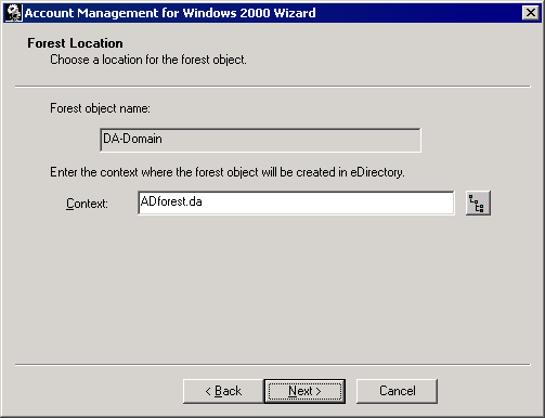 In the Forest Location page's Context field, type ADforest.DA > click Next.