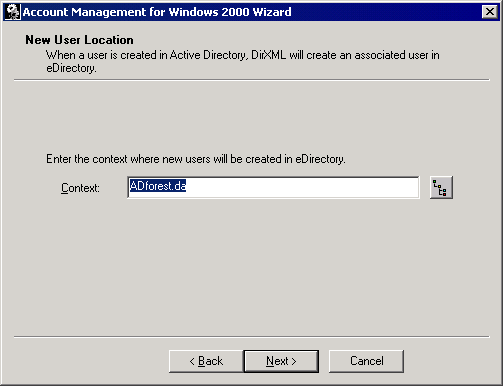 In the New User Location page's Context field, type Adforest.DA > click Next.
