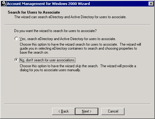 On the Search for Users to Associate page, select No, Don't Search for User Associations > click Next.