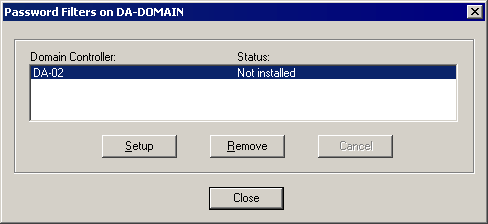 In the Password Filters on DA-Domain dialog box, click the DA-02 list item > click Setup.