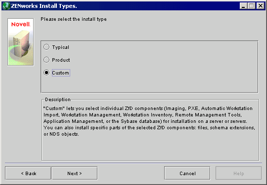In the ZENworks Install Types Window, select the Custom option > click Next to display the ZENworks Install Types window.
