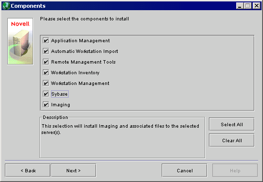 In the ZENworks Components screen, ensure that all options are selected, including the Sybase option > click Next.