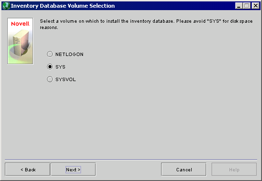 In the Inventory Database Volume Selection window, select the SYS option > click Next.