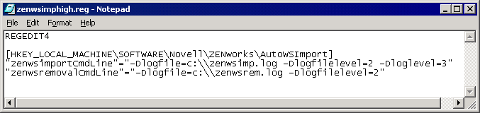 In the zenwsimp.reg Notepad window, locate the zenwsimportCmdLine line. At the end of the line, add -Dloglevel=3 after the text -Dlogfilelevel=2 as shown in the illustration below. Save the file as zenwsimphigh.reg and close Notepad.