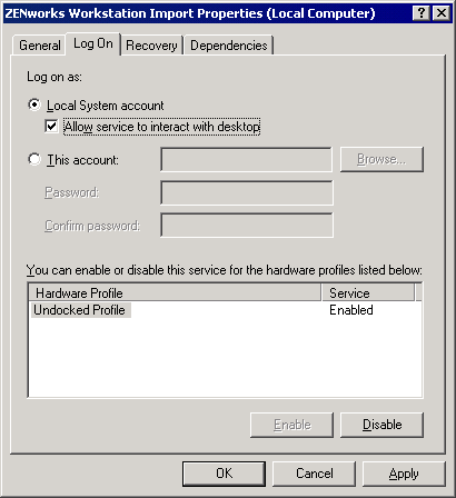 In the ZENworks Workstation Import Properties (Local Computer) window, enable Allow Service to Interact with Desktop > click OK.