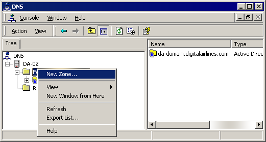 In the DNS window, double-click the DA-02 server object in the left-most pane.