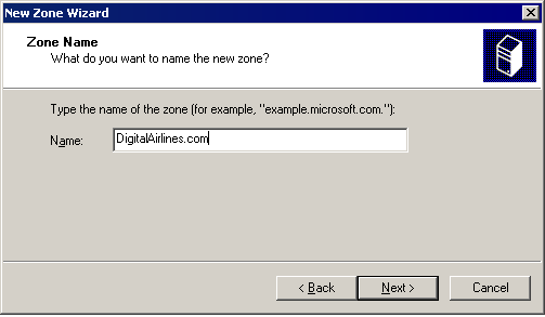 In the Zone Name window's Name field, type DigitalAirlines.com > click Next.