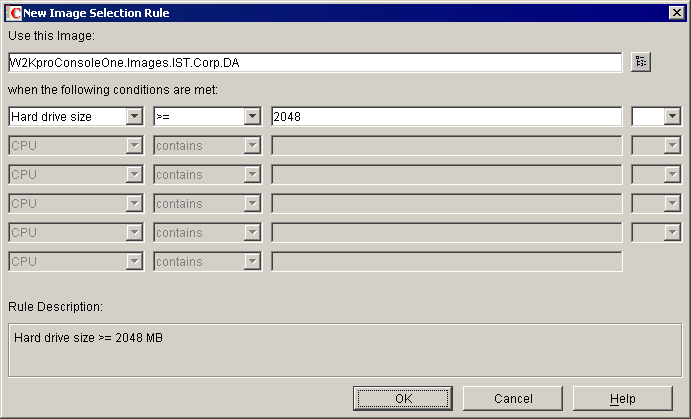 In the Use This Image field of the New Image Selection Rule dialog box, select the W2KproConsoleOne image object > in the When the Following Conditions are Met fields, select Hard Drive Size > greater than or equal to (>=) > 2048 > click OK.