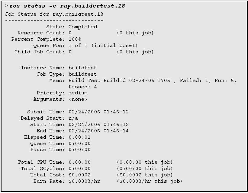 ZENworks Orchestrator enables you to monitor jobs by using the same methods outlined in Section 5.2.5, Running Your Jobs. The following figure shows examples of the status of the job ray.buildtest.18 using different monitoring interfaces: