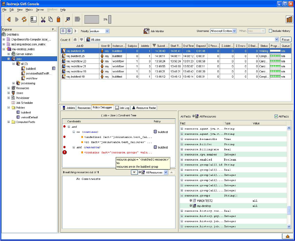 As a brief introduction to the built-in debugging capabilities of ZENworks Orchestrator, the following figure shows how to find that the buildTest job was not able to find or match any resources, because resources were not added to the buildtest group as required by the policy.