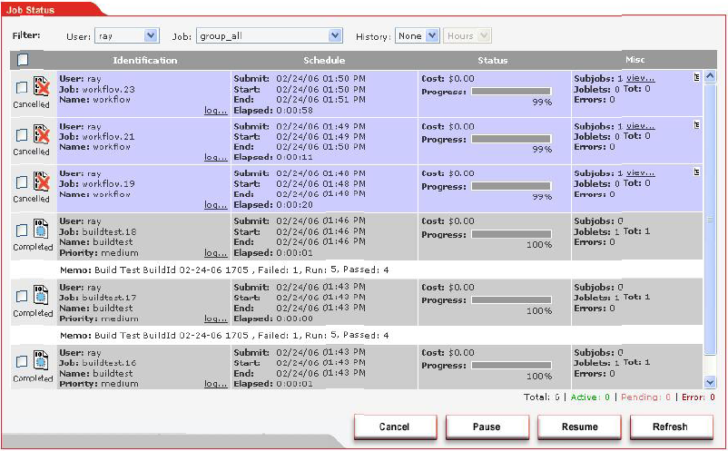 Notice in the bottom section that job costing metrics also can be monitored, which are quite minimal in this example. More sophisiticated job monitoring is possible. For more information, see Verification at the Command Line