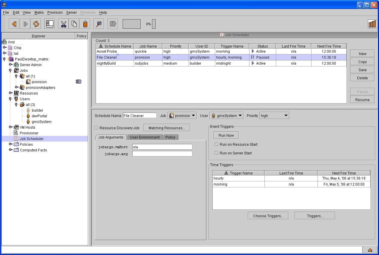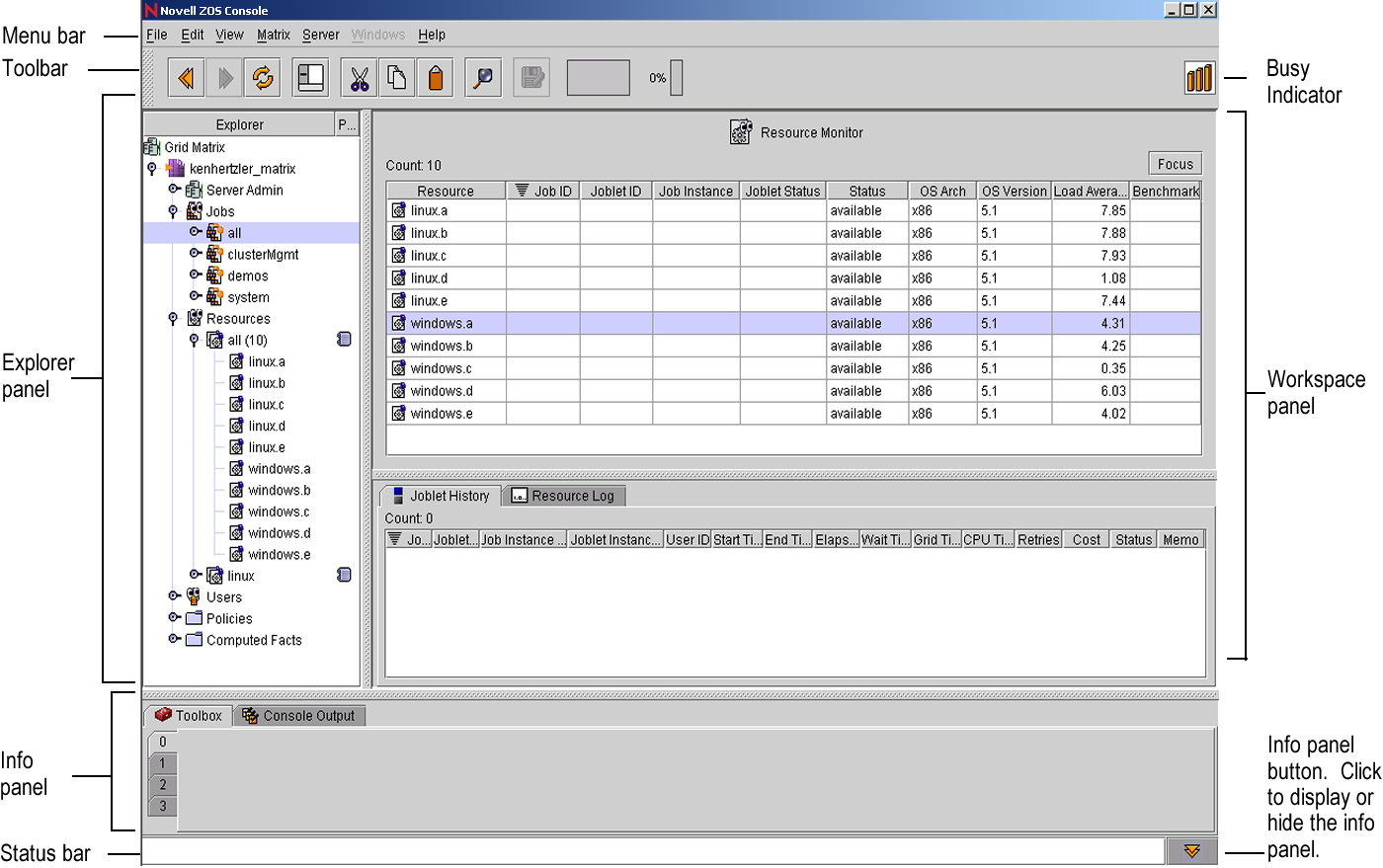 Orchestrator Server Management Interface: The ZENworks Orchestrator server, written entirely in Java using the JMX (Java MBean) interface for management, leverages this API for the ZENworks Orchestrator Console. The console is a robust desktop GUI designed for administrators to apply, manage, and monitor usage-based policies on all infrastructure resources. The console also provides at-a-glance grid health and capacity checks.