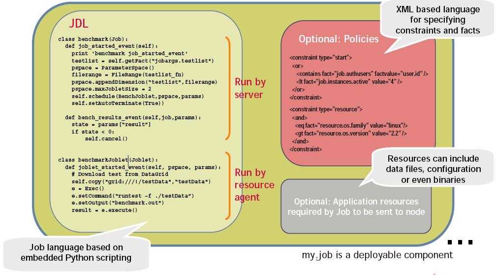A job definition is described in the embedded enhanced Python script that you create as a job developer. Each job instance runs a job that is defined by the Job Definition Lannguage (JDL). Job definitions might also contain usage policies. For more information, see the Job class.