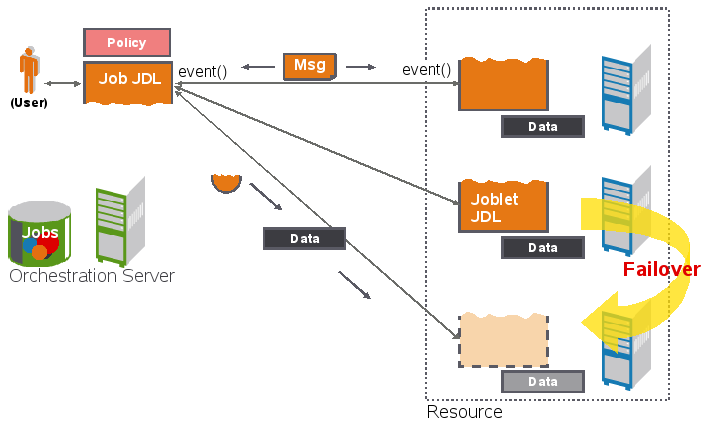 If a job allows it, a failure in any joblet causes the Orchestrator Server to automatically find an alternative resource, copy over the joblet JDL code, and reestablish the communication connection. A job also can listen for such conditions simply by defining a method for one of the internally generated events, such as def joblet_failure_event(...).