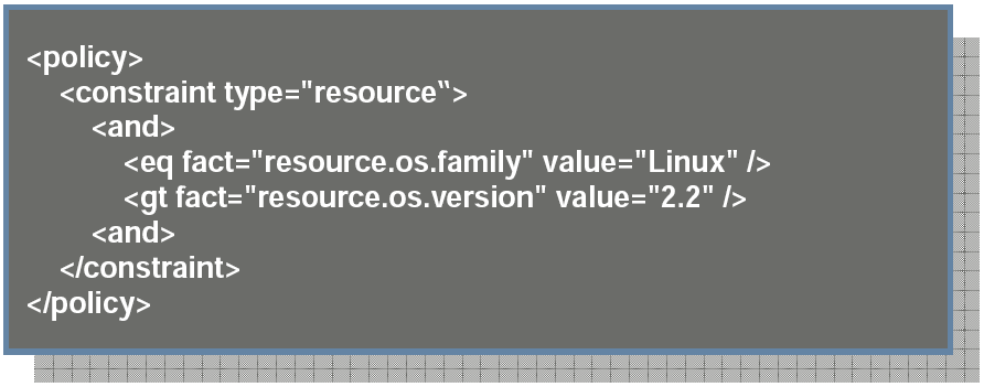 Of course, direct named access is also possible. An example of a policy that constrains the selection of a resource for a particular job or test is shown in the figure below. Although resource constraints can be applied at the policy level, they can also be described by the job itself or even dynamically composed at runtime.