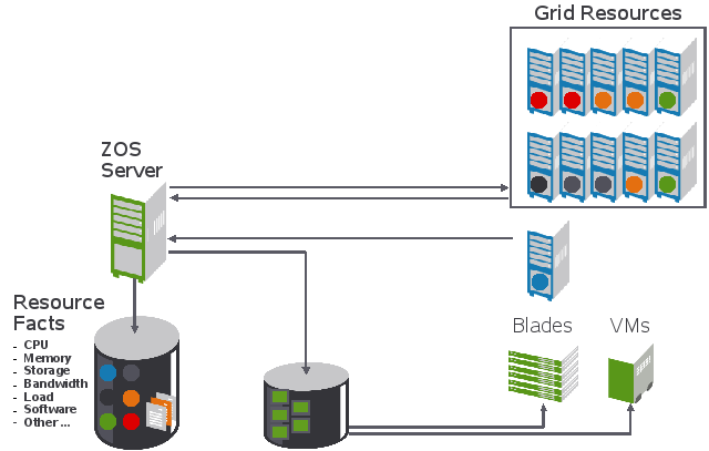 As shown in the following figure, resource discovery jobs automatically discover the resource attributes (fully extensible facts relating to CPU, memory, storage, bandwidth, load, software inventory, and so forth) of the resources being managed by the ZENworks Orchestrator server. This enables the Orchestrator Server to automatically detect new resources and to integrate resource provisioning of on-line resources. The server can also keep account of these facts for managed resources that are off line.