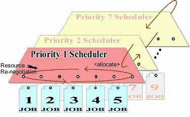 These lists are then passed to the resource allocation logic where, given the possible resources, the ordered list of desired resources is returned together with information on the minimum acceptable allocation. The scheduler uses this information to appropriate resources for all jobs within the same priority group. Because the scheduler is continually re-evaluating the allocation of resources, the job policies forms part of the schedulers real-time algorithm, thus providing an extremely versatile and powerful scheduling mechanism.