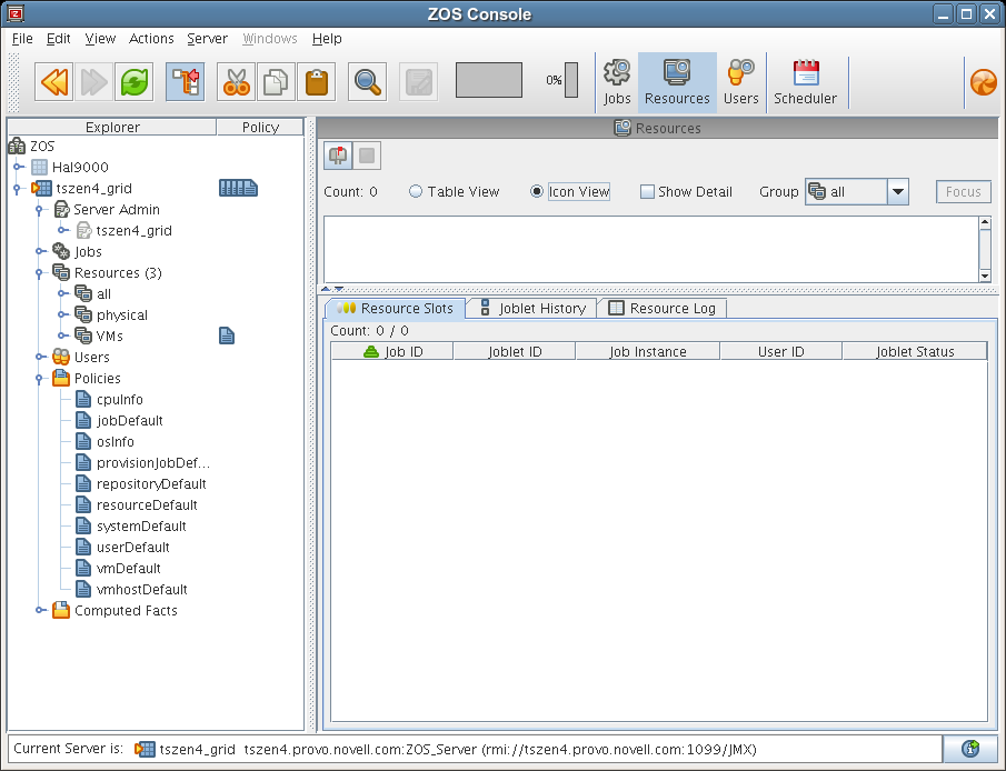 The Resources Monitor has many features to help you manage resources when they are registered, including the jobs and joblets assigned to individual resources. For more detailed information about the Resources Monitor, see “Monitoring Server Resources” in the Novell ZENworks Orchestrator 1.2 Administration Guide.
