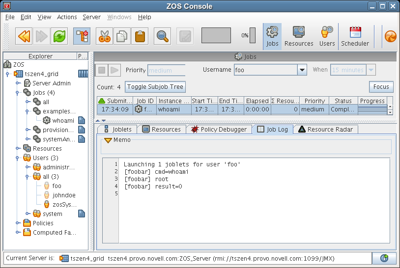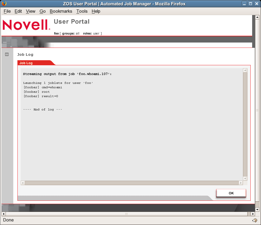 You now have a basic understanding of the User Portal and how to use it to verify that a job has run. As the last experiment in the walkthrough for ZENworks Orchestrator, you can use the zosadmin command line to gather information about your system. For more information, see Section 5.9, Walkthrough: Use the zosadmin Command to Gather Information.