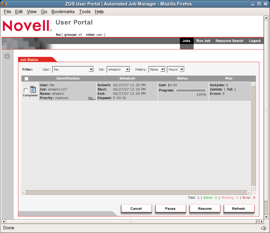 Job JobID User Started Elapsed Statewhoami foo.whoami.24 foo 06/26/2007 07:19:35 0:00:01 Completed
