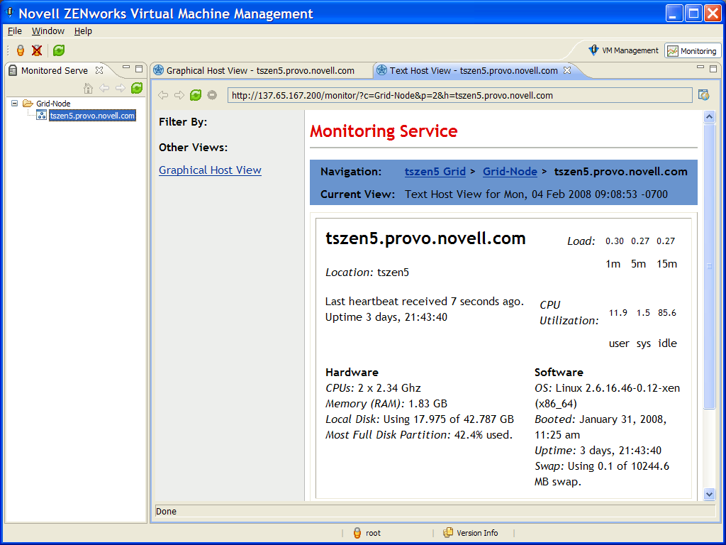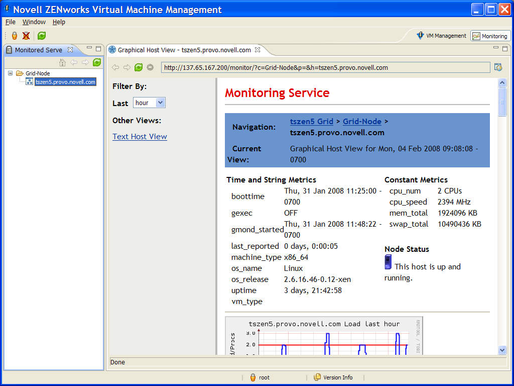 The left pane displays the groups or clusters of physical and VMs you can monitor. In the editing pane, you see a Web page where you define the parameters of how you want to monitor the selected machine. You can set the metric, time constraint, and how you want the data sorted in the display from the drop-down boxes on the left of the edit view. For details about the monitoring service, see Section 5.2, Monitoring Virtual Machines.