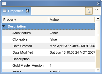 The Properties view displays specific information and properties of a selected VM, whether selected from the Workspace or Warehouse view. The property is named and its description is given in the column. The following figure represents the Properties view.