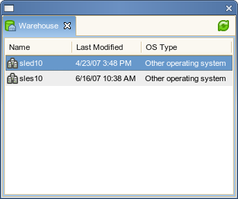 The Warehouse view shows all checked-in VMs, their names, most recent modification, and operating system type. The following figure represents the VM Warehouse with some checked in VMs.
