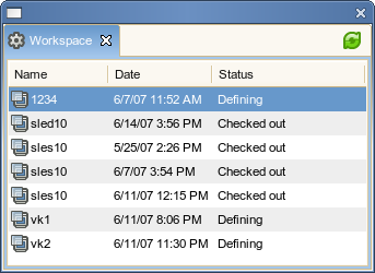 The Workspace provides access to the VM Builder and also lists VMs that have not been checked in or are in a checked out state copied from the Warehouse. You can build a new VM, edit the metadata attached to the VM, edit the VM image, and check in the VM to the VM Warehouse. The VM name, and creation or check-out date. These different states are: