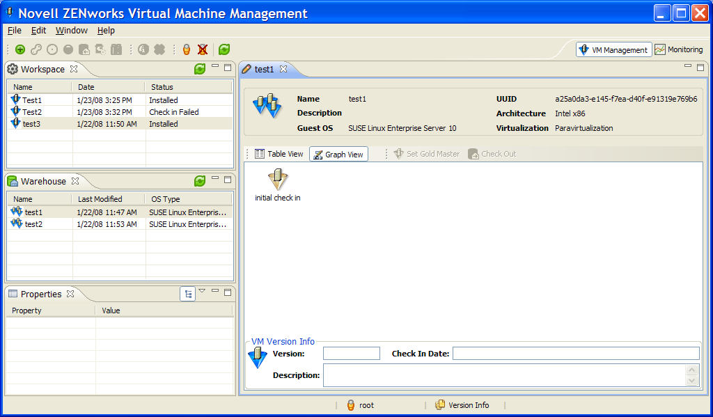 The VM Management perspective contains the Workspace view, VM Warehouse view, and the Properties view on the left side of the default perspective setup. The editor view space is the large section to the right.