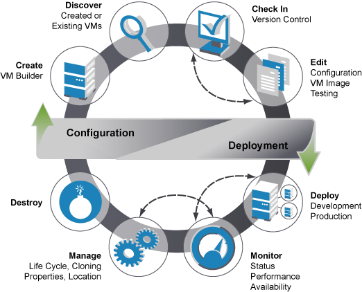 The VM life cycle is divided into two parts: configuration and deployment. Configuration is performed on a VM in the security of a development environment which allows for creation, testing, and modification of the VM until you are ready to launch the VM into the production environment. Deployment is performed in the production environment and the changes take place in real time. As the administrator, you might do both the configuration and deployment tasks.