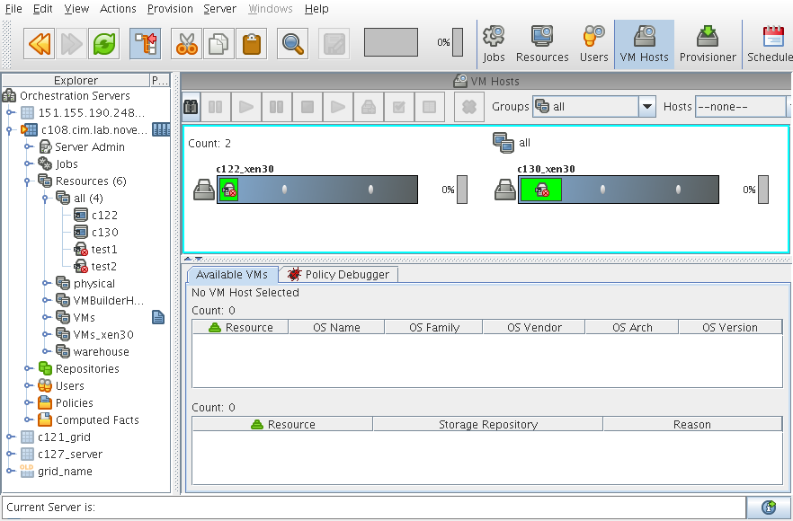 Provisioning adapters on the Orchestrator Server abstract the VM. These adapters are special provisioning jobs that perform operations for each integration with different VM technologies. The following figure shows the VM host management interface that is using the Orchestrator console.