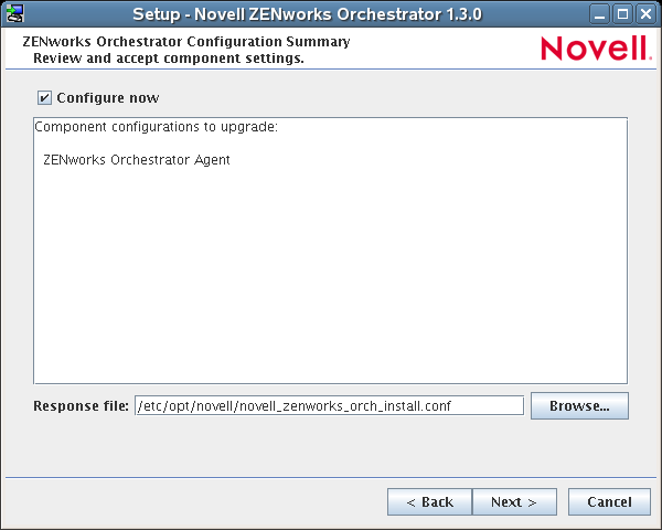 Deselect the Configure now check box so that the wizard can write the configuration file to /etc/opt/novell/novell_zenworks_orch_install.conf without starting Orchestrator or applying the configuration settings.