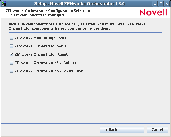 Accept the agreement, then click to display the ZENworks Orchestrator Configuration Selection page.