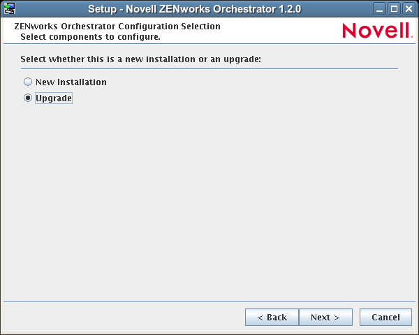 Welcome to Novell ZENworks Orchestrator. This program will configure Novell ZENworks Orchestrator 1.3 Select whether this is a new install or an upgrade i) install u) upgrade - - - - - - Selection [install]: