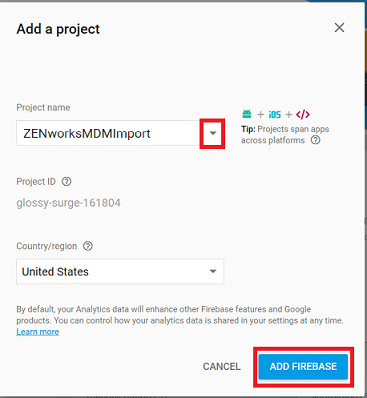 Click the Project Name drop-down menu and select the GCM project that you want to import. Click Add Firebase.