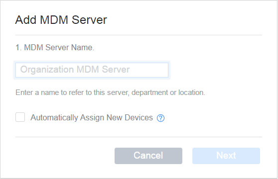 Specify a name for the virtual MDM Server. You can also choose to automatically assign newly purchased devices to this virtual MDM Server.