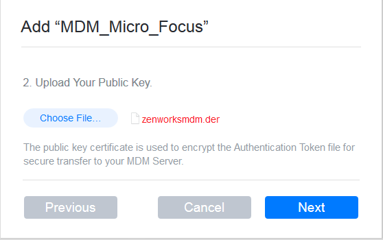 Upload the Public Key certificate of the ZENworks MDM Server that you had saved in Step 3. Click Next.