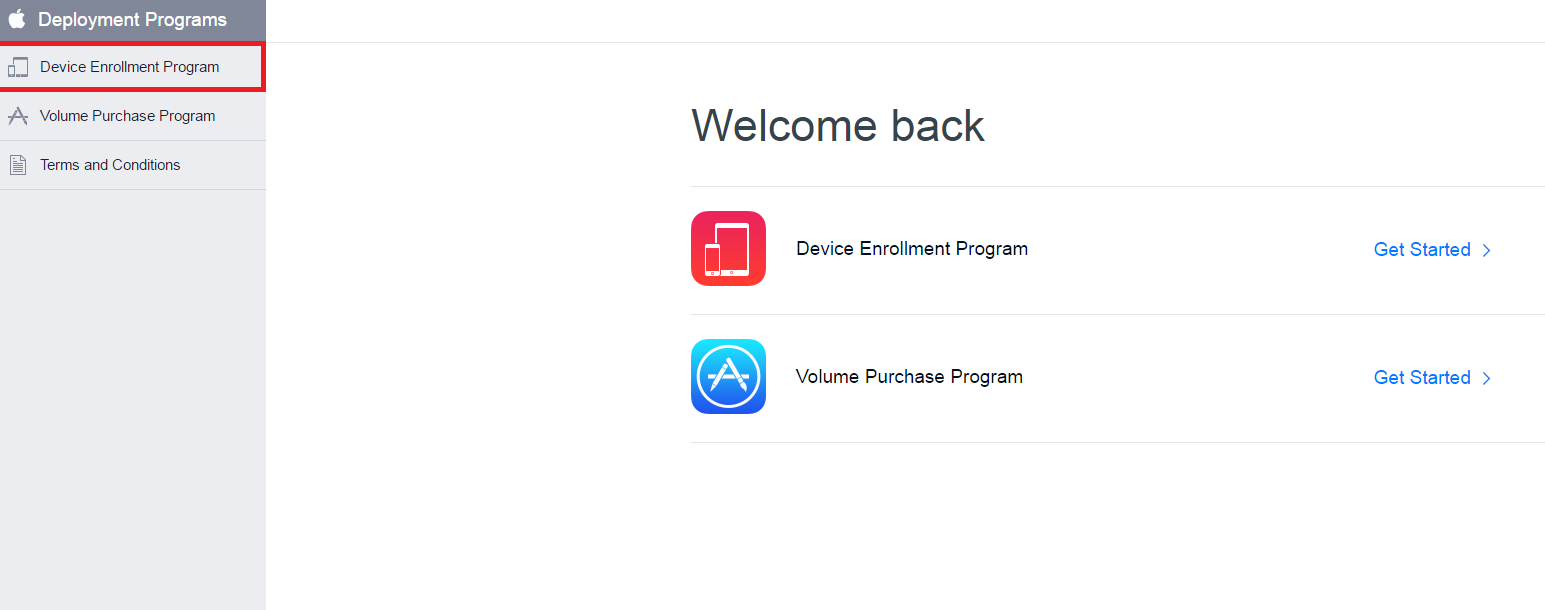Select Device Enrollment Program on the Welcome screen or on the left pane of the page.