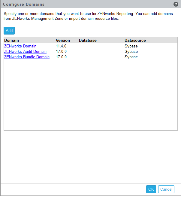 Specify one or more domains that you want to use for ZENworks Reporting. You can add domains from ZENworks Management Zone or import domain resource files.