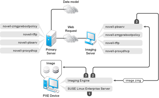 The following sections explain how the Preboot Services work for PXE boot, ZENworks Imaging, and third-party imaging on the Imaging Satellite: