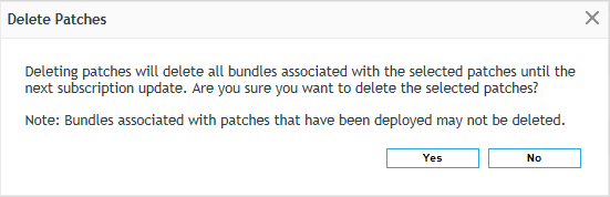 IMPORTANT:If any of the patches you are deleting are deployed, those patches and their associated bundles are not deleted. In this case, when you click Yes to the Delete Patches message, another prompt will open, informing you of the dependencies to deployed bundles and their bundle identification numbers. These bundles can be from patch policies and/or patch remediations.