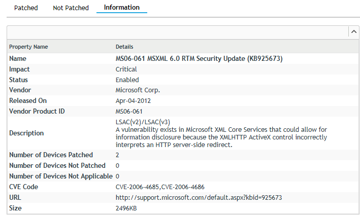 Patched: Displays a link indicating the total number of devices to which the corresponding patch has been applied.