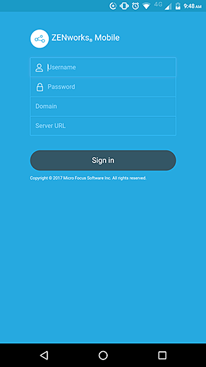 NOTE:If instead of the login screen, the device’s home screen is displayed, then open the ZENworks Agent App from the Applications Menu on your device.