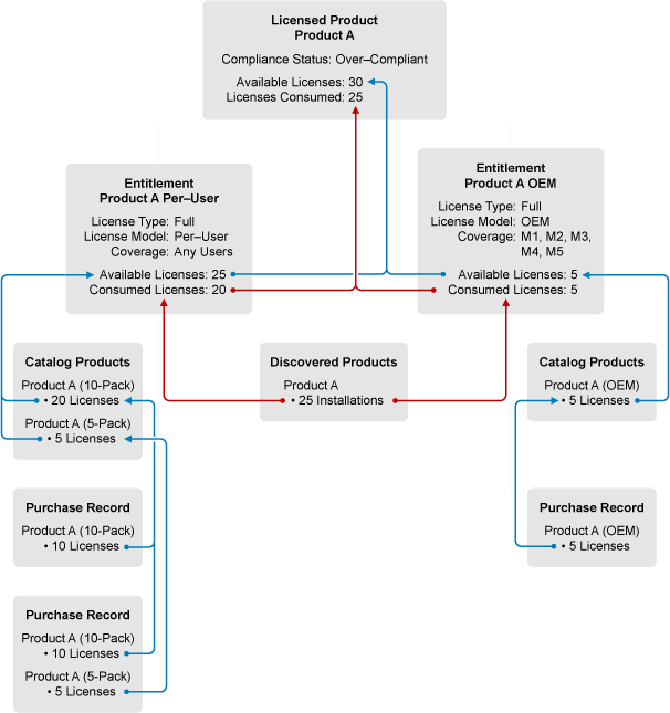 As a result, a single software product might have multiple catalog products. This allows you to assign the appropriate catalog products to the appropriate entitlements. In the example, the catalog products that represent non-OEM versions of Product A are associated with the Product A Per-User entitlement, resulting in 25 available licenses. The Product A OEM catalog product is associated with the Product A OEM entitlement, resulting in 5 available licenses.