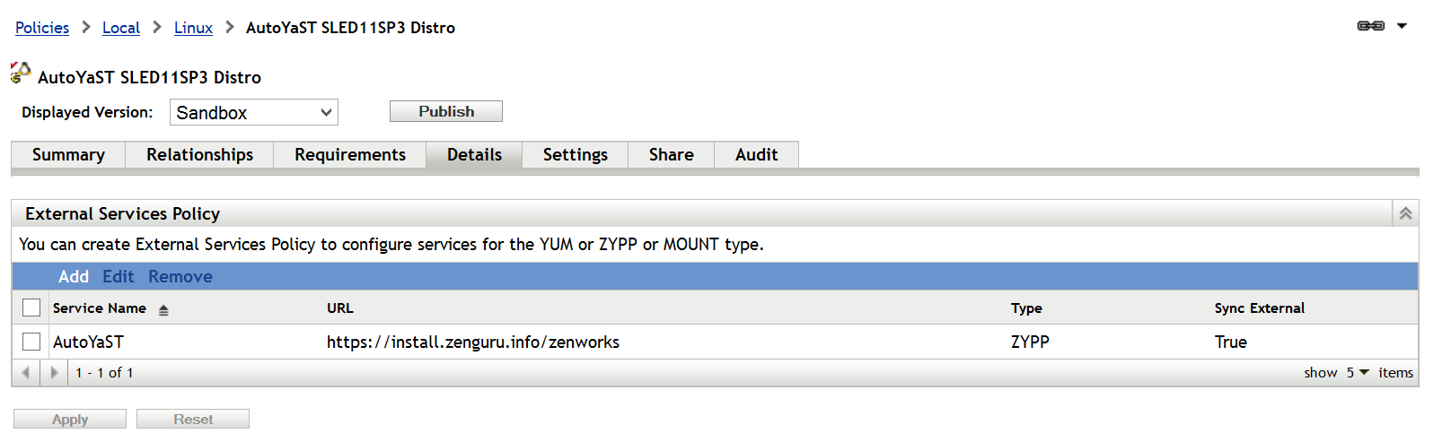 The ZENworks agent is capable of using packages from ZENworks bundles (Linux and LDB), RPM-MD Repositories (YUM), and YaST/ZYPP type libraries (SUSE) for dependency resolution. If you already have the base distro packages on a Kickstart or and AutoYaST server you may want to use an External Services policy to deploy the repository to the device instead of using a Linux Dependency Bundle. The main advantage is that you can have a single source for the operating system bundles. The properties of an External Service policy is shown below: